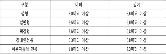 ¡Þ ÁÖ¿ä³»¿ë¾ÕÀ¸·Î Â÷·® Å©±âÀÇ È®´ë ¹× ¹® ¿¸² ¿©À¯ Æø µîÀ» °í·ÁÇÏ¿© ÆòÇàÁÖÂ÷Çü½Ä ¿ÜÀÇ ÁÖÂ÷ÀåÀ¸·Î¼ ÀϹÝÇüÀÇ °æ¿ì ³Êºñ ÃÖ¼Ò ±âÁØÀ» 2.3¹ÌÅÍ¿¡¼ 2.5¹ÌÅÍ, È®Á¤ÇüÀÇ °æ¿ì 2.5¹ÌÅÍ¿¡¼ 2.6¹ÌÅÍ·Î ÇÏ´Â µî ÆòÇàÁÖÂ÷Çü½Ä ¿ÜÀÇ ÁÖÂ÷ÀåÀÇ ÁÖÂ÷±¸È¹ ÃÖ¼Ò ±âÁØÀ» È®´ëµÈ´Ù. ÀÌ °³Á¤µÈ ±âÁØÀº 2019³â 3¿ù1ÀϺÎÅÍ Àû¿ëµÈ´Ù. ¡Þ °³Á¤¹ý·ÉÁÖÂ÷Àå¹ý ½ÃÇà±ÔÄ¢Á¦3Á¶(ÁÖÂ÷ÀåÀÇ ÁÖÂ÷±¸È¹) ¨ç ¹ý Á¦6Á¶Á¦1Ç׿¡ µû¸¥ ÁÖÂ÷ÀåÀÇ ÁÖÂ÷´ÜÀ§±¸È¹Àº ´ÙÀ½ °¢ È£¿Í °°´Ù. <°³Á¤ 2012.7.2., 2018.3.21.>1. ÆòÇàÁÖÂ÷Çü½ÄÀÇ °æ¿ì